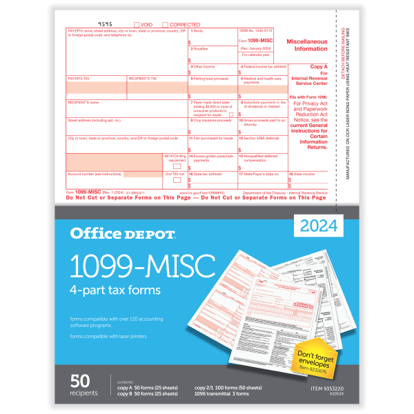 Take the stress out of tax time with the Office Depot Brand 1099-MISC Laser Tax Forms. These tax forms are made of acid-free paper and heat-resistant ink to help prevent yellowing and fading, and they…