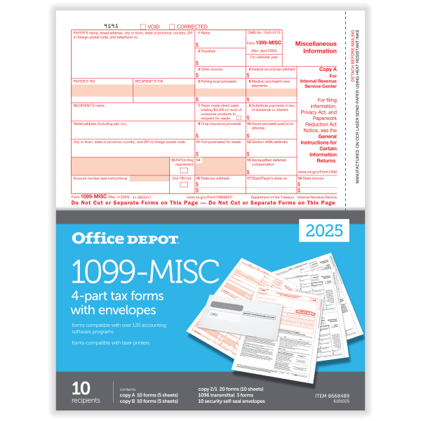 slide 2 of 4, Office Depot® Brand 1099-MISC Laser Tax Forms And Envelopes, 4-Part, 2-Up, 8-1/2"" x 11"", Pack Of 10 Form Sets, 1 ct