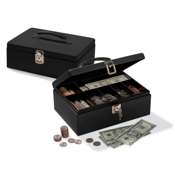 This steel cash box is equipped with a handle for easy carrying. Features 7 plastic compartments and a lock with 2 keys. Available in putty or black (no color choice).