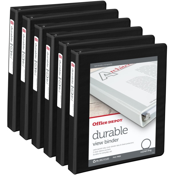 Organize filler paper or completed homework in these Office Depot durable view roundring binders. Sturdy covers keep pages protected, while the threering design is compatible with punched pages. A cle…