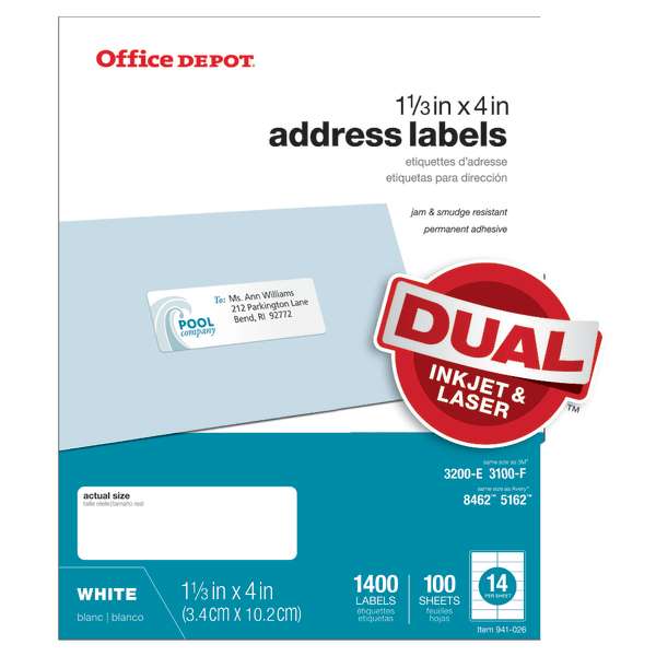 Office Depot Brand Inkjet/Laser Address Labels, Rectangle, 1 1/3"" X 4"", White, Pack Of 1,400