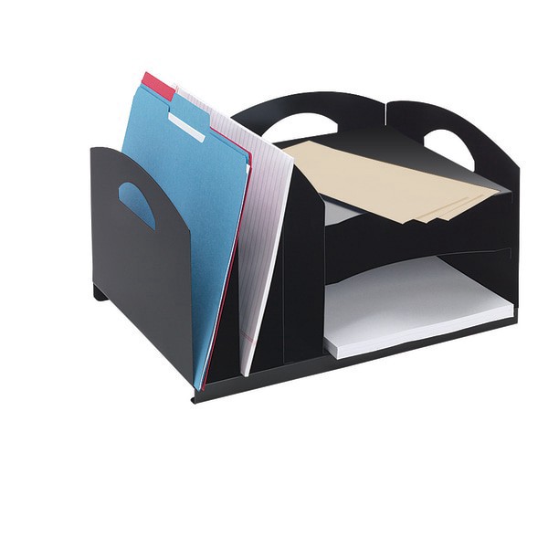 Organize binders, catalogs, books, files and paper - all in the same unit! 3 vertical pockets and 3 horizontal shelves. Nonskid pads protect your worksurface.