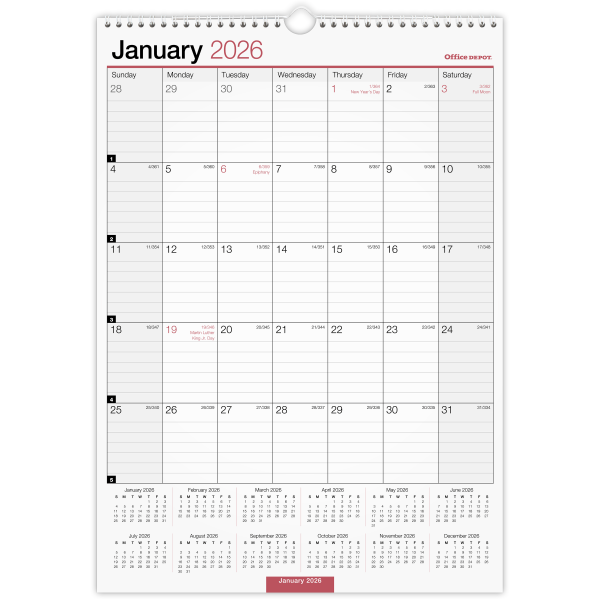 Office Depot Brand Monthly Wall Calendar, 12"" x 17"", White, January 2026 to December 2026, OD30162826