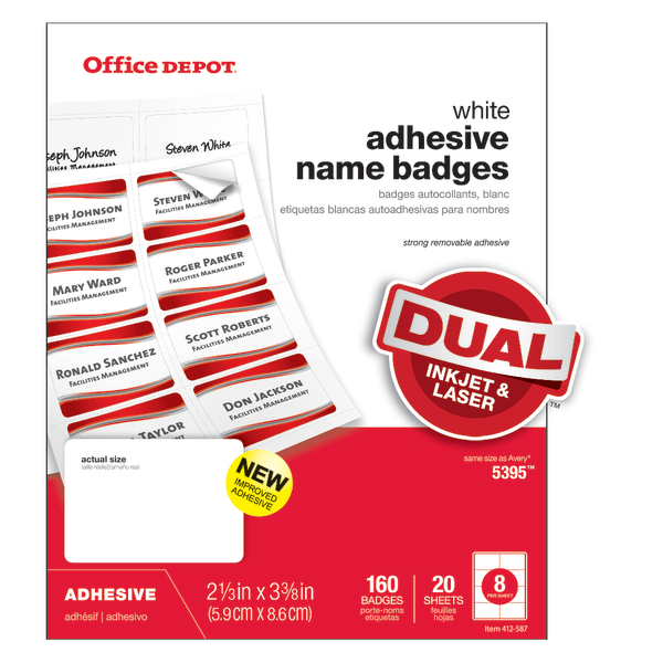 slide 3 of 3, Office Depot Brand Name Badge Labels, 2 1/3"" X 3 3/8"", White, Pack Of 160, 160 ct