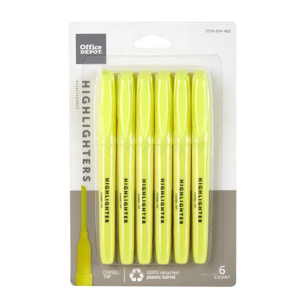 slide 2 of 2, Office Depot® Brand Pen-Style Highlighters, Chisel Point, 100% Recycled Plastic Barrel, Fluorescent Yellow, Pack Of 6, 6 ct