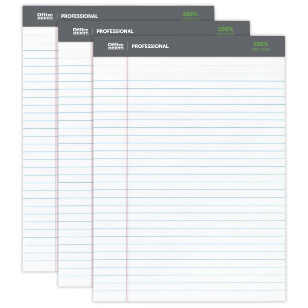 Office Depot Brand Professional Writing Pads, 8-1/2" X 11-3/4", Legal/Wide Ruled, 50 Sheets, 100% Recycled, White, Pack Of 3 Pads