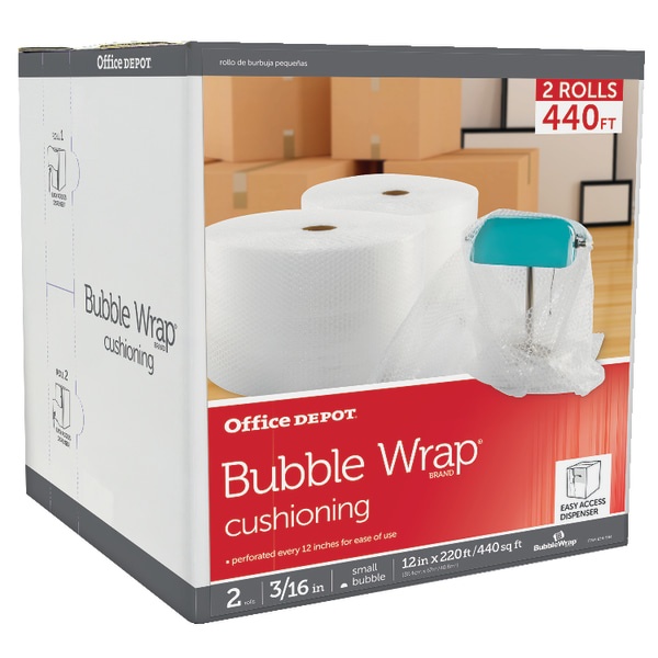Office Depot Brand Small Bubble Wrap, 3/16'' Thick, Clear, 12'' X 220', Box Of 2 Rolls
