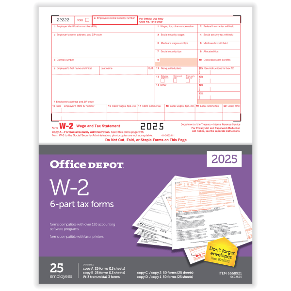 slide 2 of 3, Office Depot® W-2 Laser Tax Forms, 6-Part, 2-Up, 8-1/2"" x 11"", Pack Of 25 Form Sets, 5602525, 1 ct