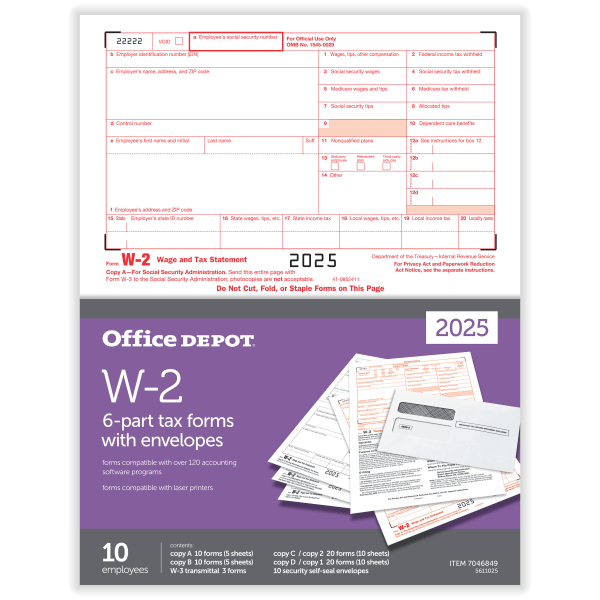 slide 3 of 4, Office Depot® W-2 Laser Tax Forms And Envelopes, 6-Part, 2-Up, 8-1/2"" x 11"", Pack Of 10 Form Sets, 5611025, 1 ct