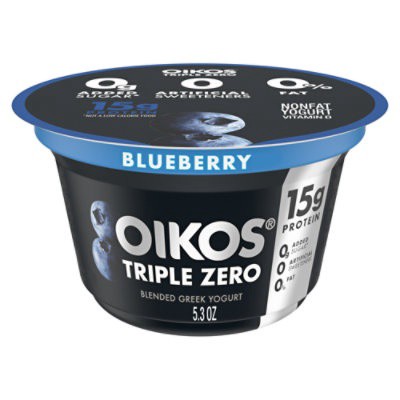 Enjoy epic tastes with Oikos Triple Zero Nonfat Blueberry Greek Yogurt, the delicious nonfat Greek yogurt cup with more of what you want and less of what you don’t. Each Oikos Triple Zero yogurt cup c…