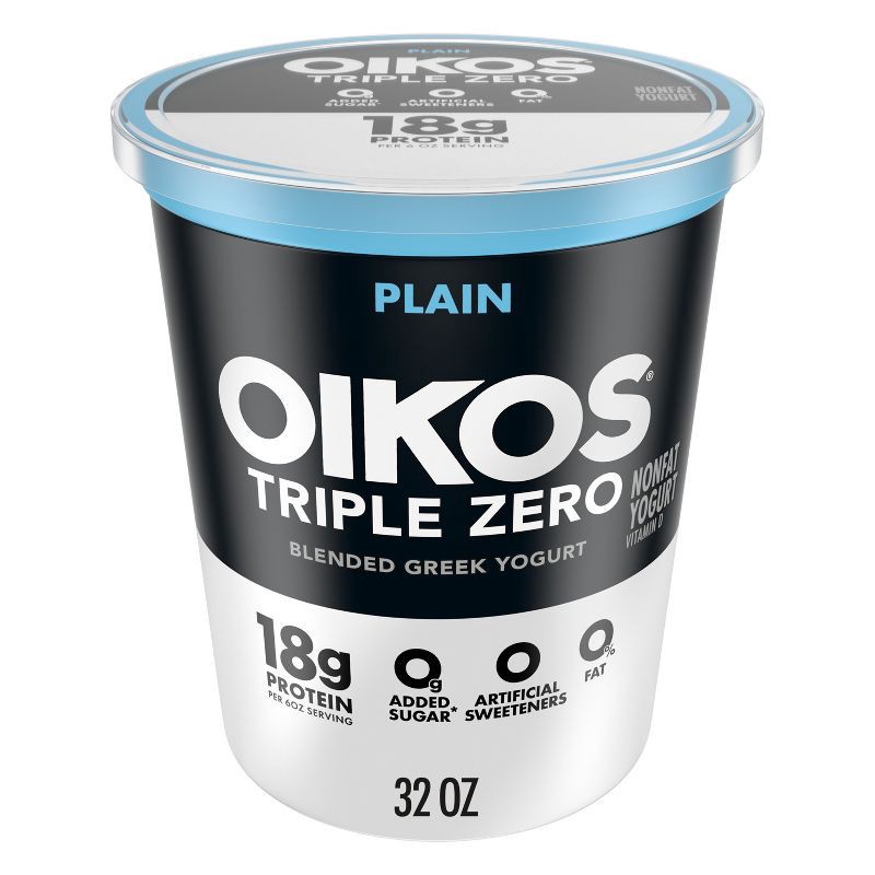 - STRONGER MAKES EVERYTHING BETTER: One 32 oz tub of Oikos Triple Zero Plain 0g Added Sugar*, Greek Nonfat Yogurt