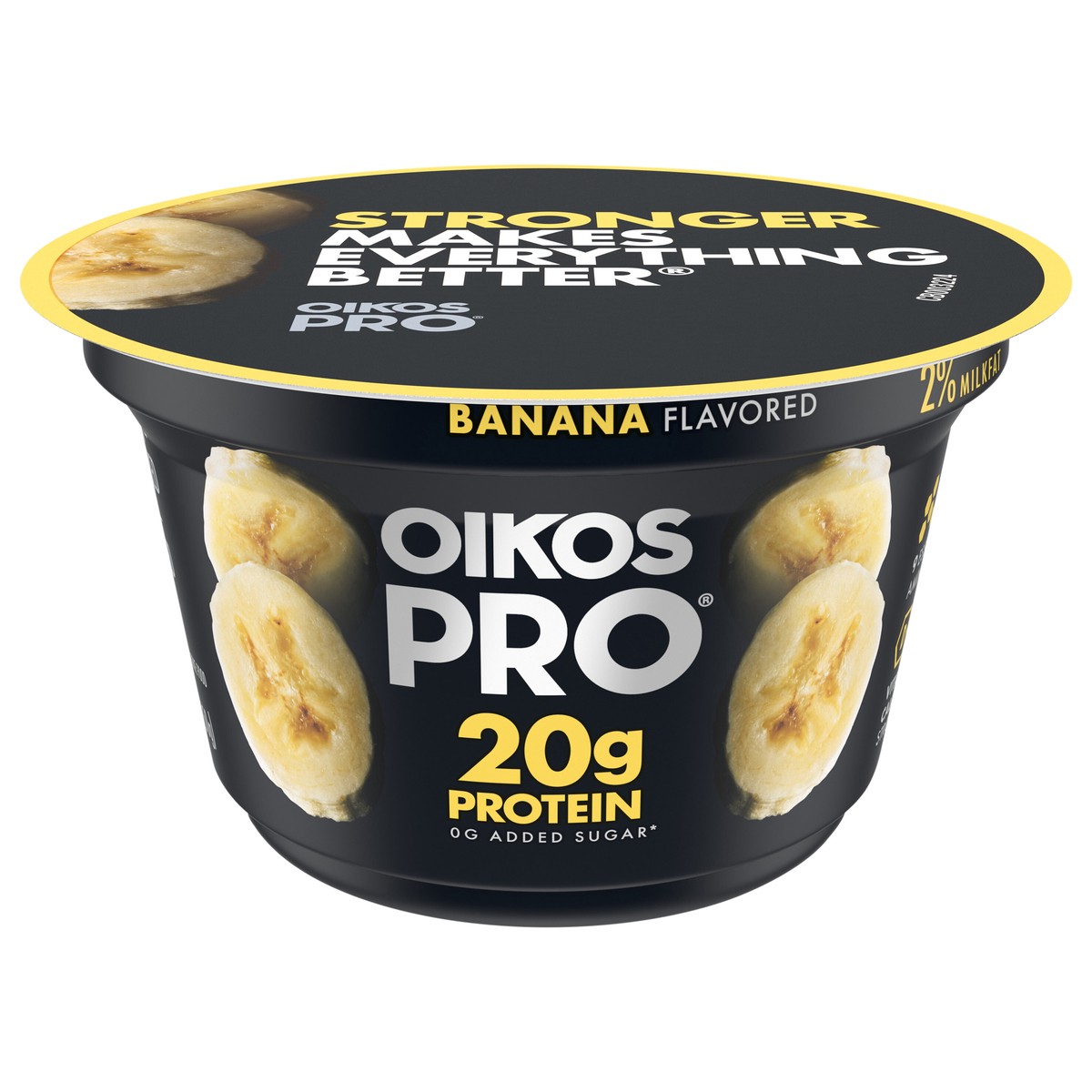 Go Pro with Oikos Pro Banana Yogurt-Cultured Ultra-Filtered Milk Product, the spoonable high protein snack with more of what you want, and less of what you don’t. Every serving contains 0g added sugar…