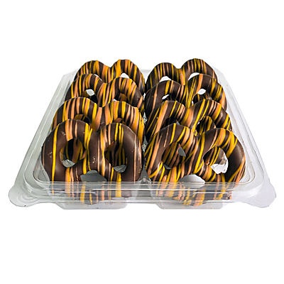 From Olivier's Candies, these salted Dutch twisted pretzels are smothered in chocolate and drizzled with rich orange and yellow icing. They make a fun surprise in a packed lunch or a scrumptious addit…
