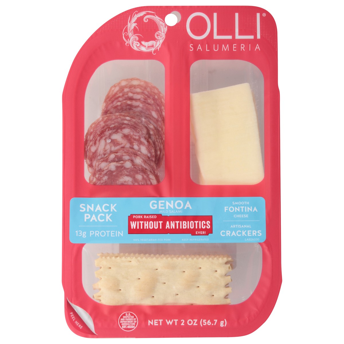 Genoa mild salami. Smooth fontina cheese. Artisanal crackers. Pork raised without antibiotics ever. 100% vegetarian-fed pork.
