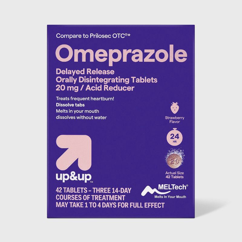 Compare to Prilosec OTC. Up&Up Omeprazole Delayed Release Orally Disintegrating Tablets, 20 mg, Acid Reducer, Strawberry Flavor, melts in your mouth and dissolves without water. Treat frequent heartbu…
