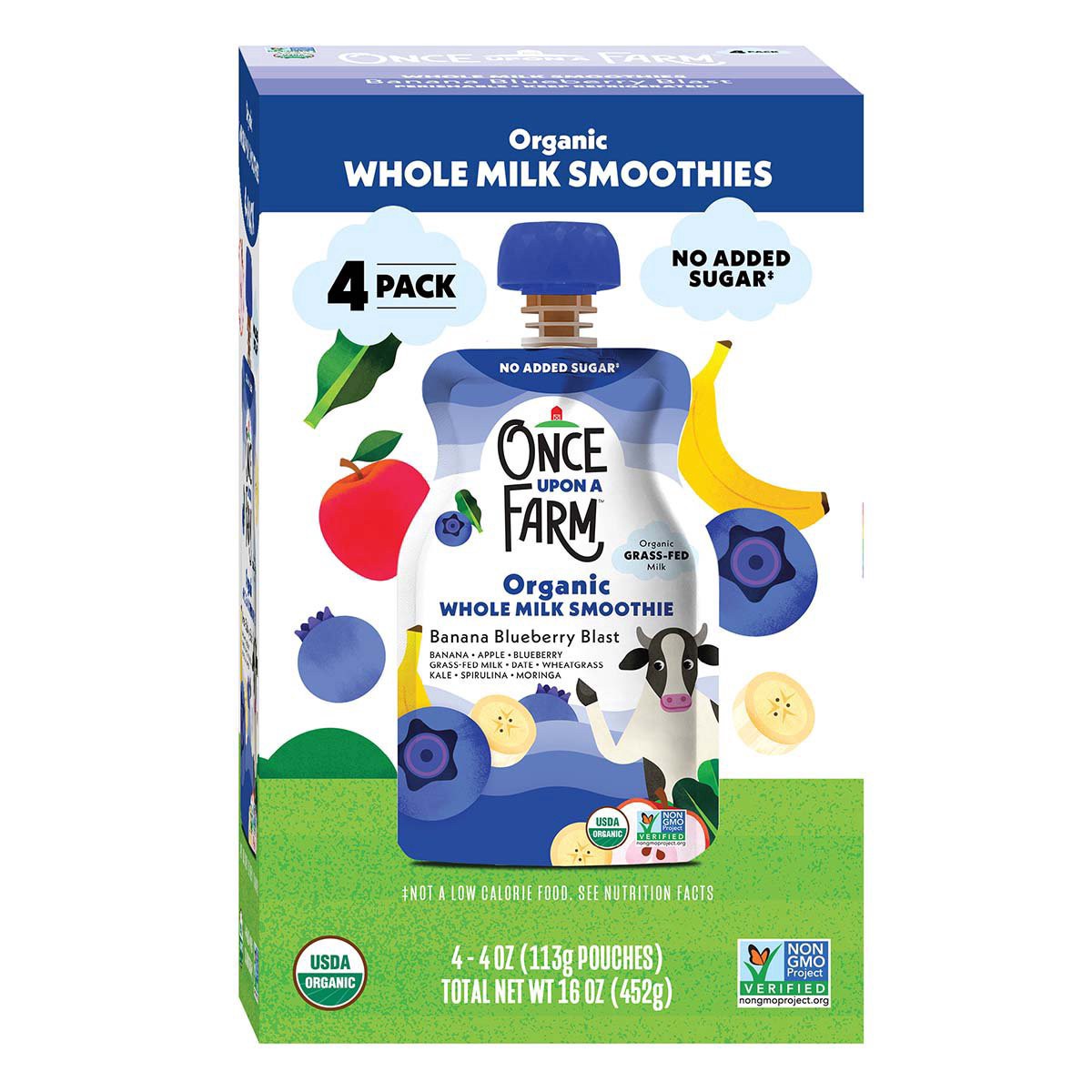 BANANA*, APPLE*, BLUEBERRY PUREE*, GRASS-FED WHOLE MILK*, DATE*, LEMON JUICE*, GREENS POWDER BLEND* (WHEATGRASS*, KALE*, SPIRULINA*, MORINGA*.) *ORGANIC