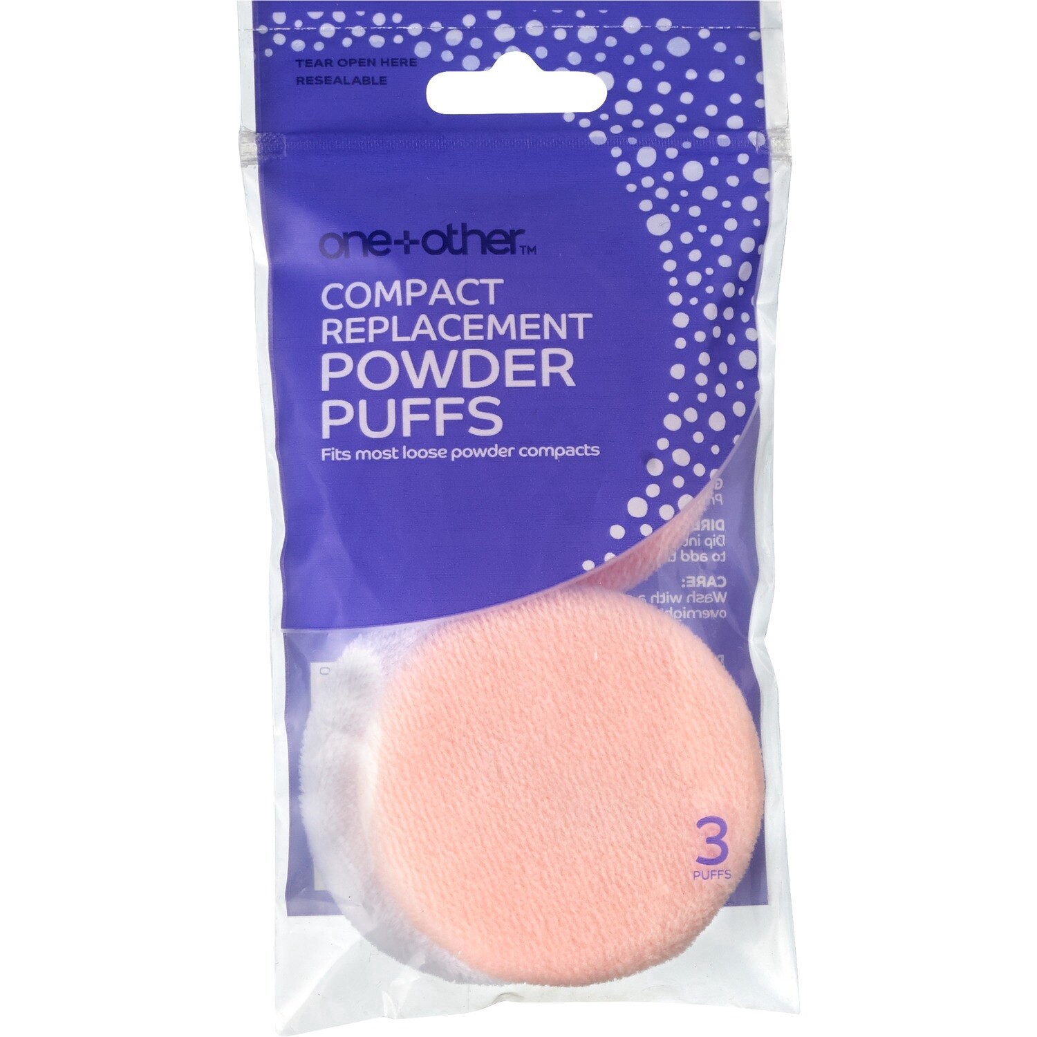 Includes 3 compact powder puffs. Fits most loose powder compacts. Great for applying foundation powder or finishing powder. Hi! We're one+other&trade (or "one another"). Our self-care essentials are s…