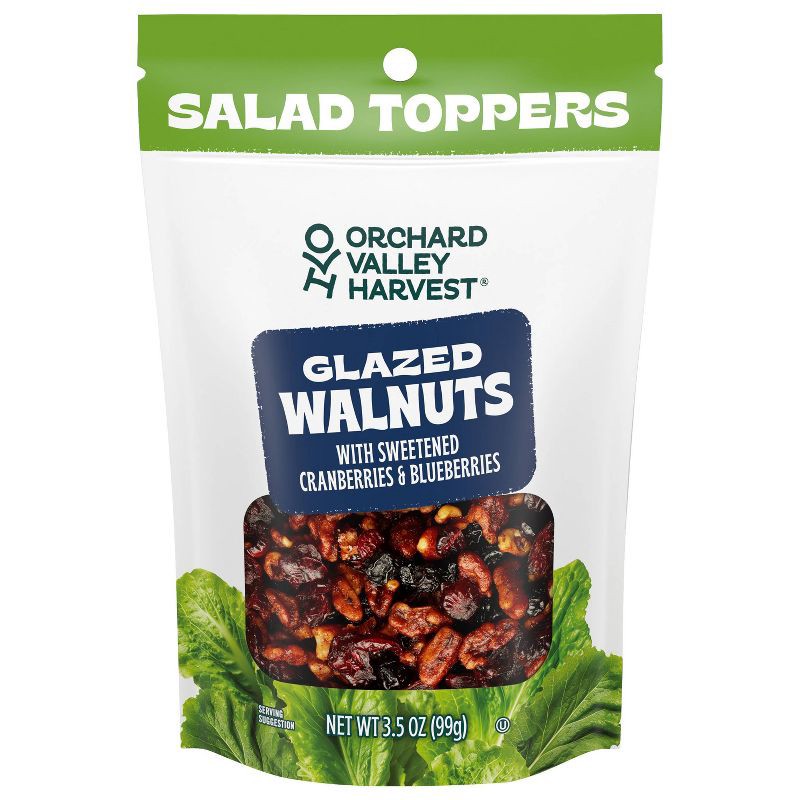 - Elevate your meals with Orchard Valley Harvest Salad Toppers! This mix of glazed walnuts, dried cranberries and dried blueberries adds flavor, sweetness and crunch to salads, oatmeal and more. The resealable bags keeps the product fresh.