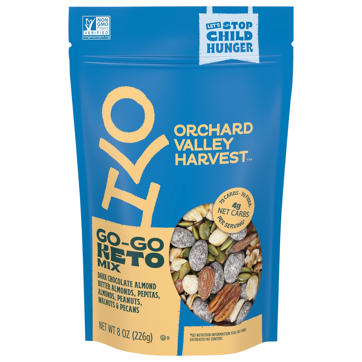 Contains 1 resealable 8-ounce bag of Orchard Valley Harvest Go-Go Keto Mix