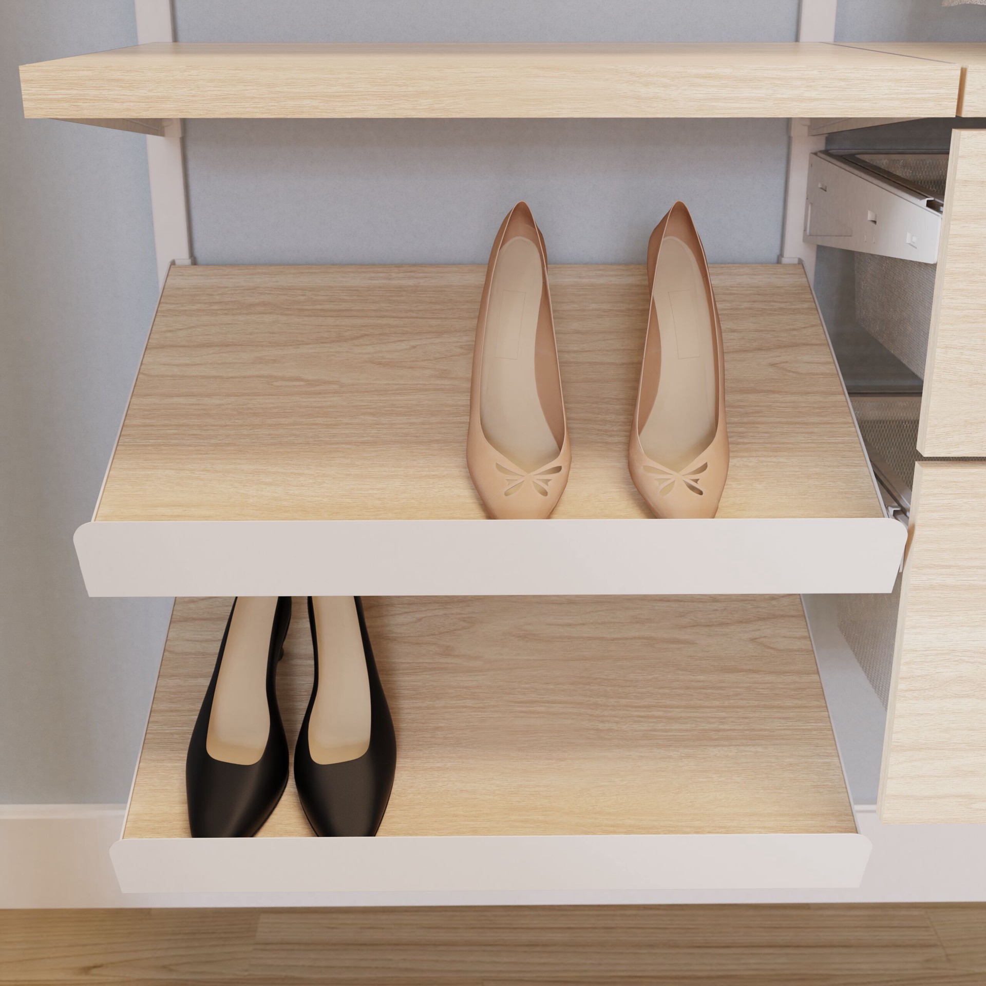 Accessory Kit is compatible with all Origin 21 Closet System Kits. Kit includes 2 angled arm brackets, wood shelf and front angle plate. Easy assembly and installation onto existing vertical standards…