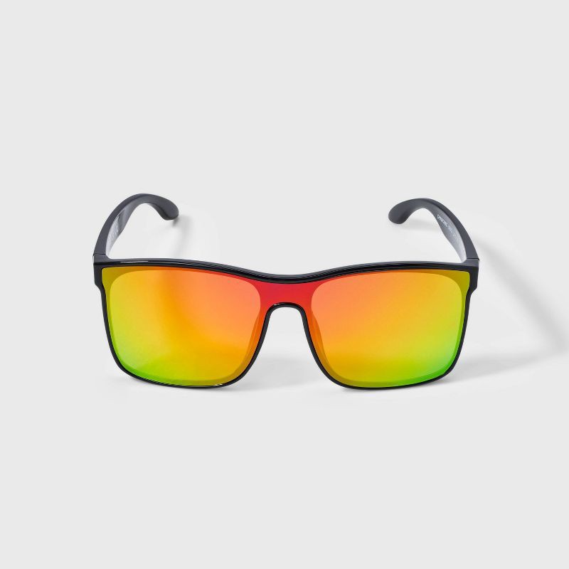 Shield sunglasses with a shiny black plastic frame and colorful lenses. Offer maximum UV protection to keep eyes shielded from harmful sun rays, and designed with scratch-resistant properties for worr…