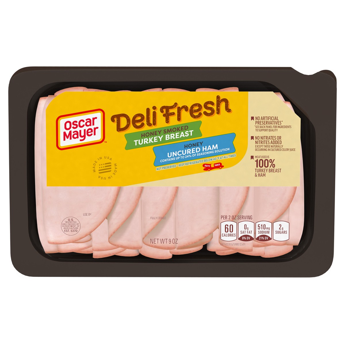 Make a delicious deli sandwich at home with Oscar Mayer Deli Fresh Honey Smoked Turkey Breast & Honey Uncured Ham, Contains Up To 24% Of a Seasoning Solution, Browned with Caramel Color, Sliced Lunch …