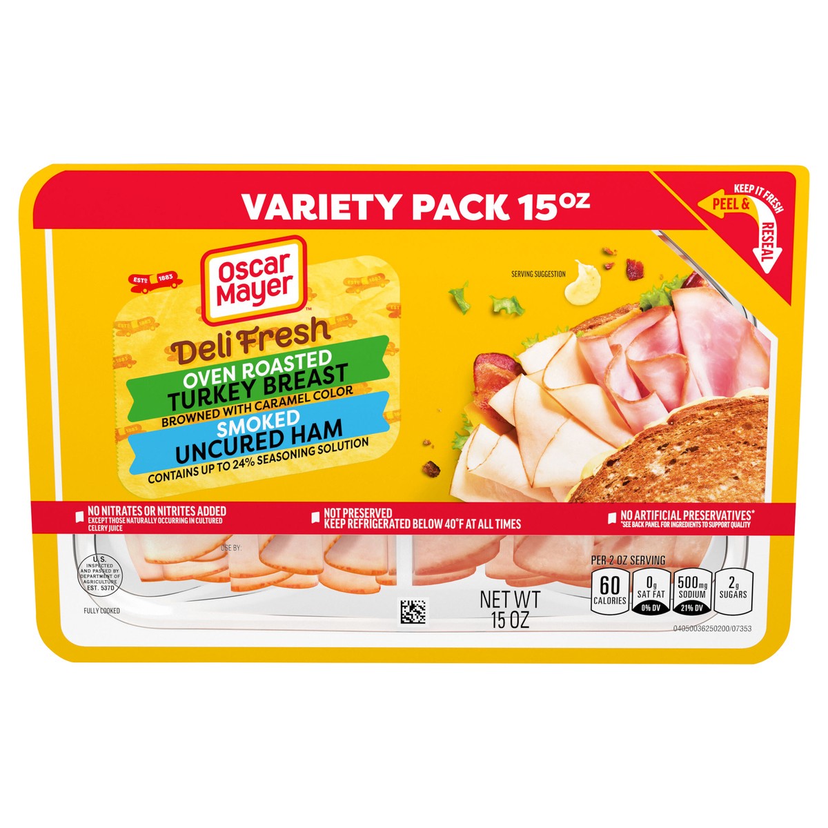 Make a delicious deli sandwich at home with Oscar Mayer Deli Fresh Oven Roasted Turkey Breast browned with caramel color & Smoked Uncured Ham contains up to 24% of seasoning solution browned with cara…
