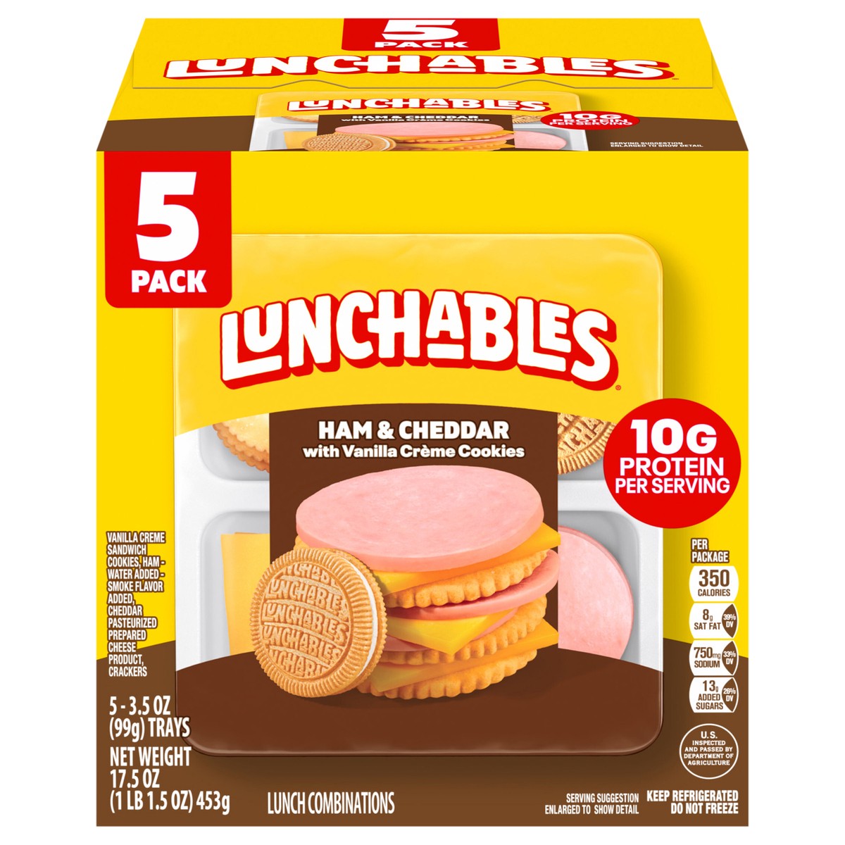 Have fun with lunch! Lunchables Ham & Cheddar with Vanilla Creme Cookies lets kids eat it their way — no prep needed! Each 3.5-ounce kit in our 5-pack contains ham with water and smoke flavor added an…