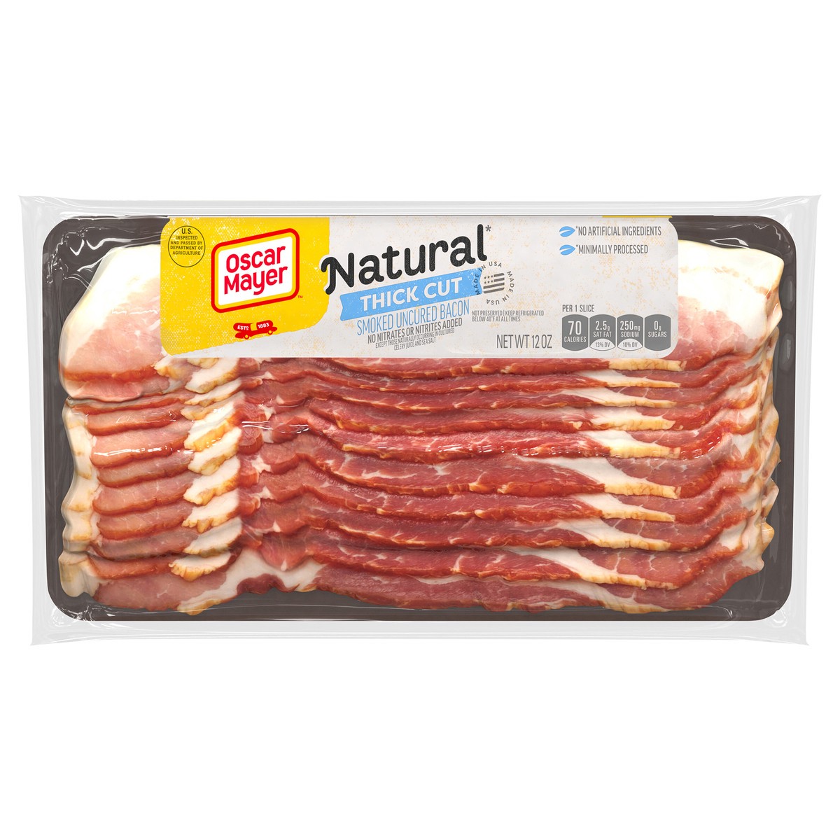 Everything is better with bacon. Oscar Mayer Natural Thick Cut Smoked Uncured Bacon Slices have no artificial ingredients and are made with no added nitrates or nitrites, except those naturally occurr…