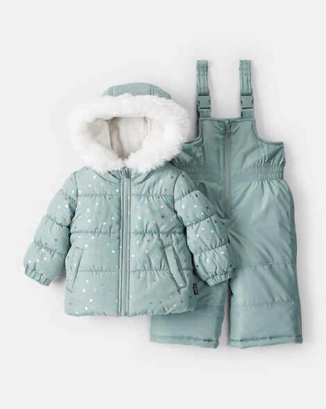 Oshkosh Baby Girl 2-Piece Polka Dot Hooded Snowsuit Jacket & Bib Set - Green Turquoise 18M