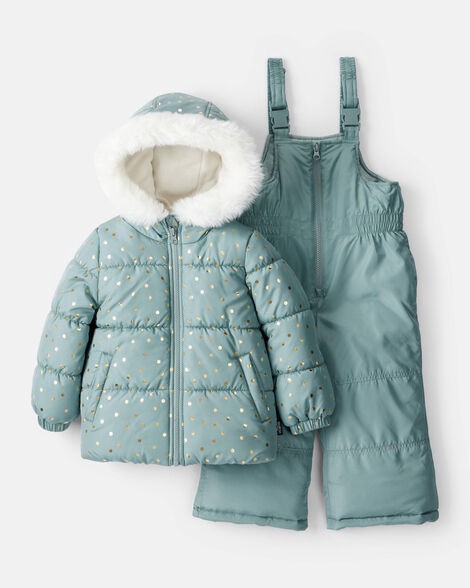 Oshkosh Toddler Girl 2-Piece Polka Dot Hooded Snowsuit Jacket & Bib Set - Green Turquoise 3T