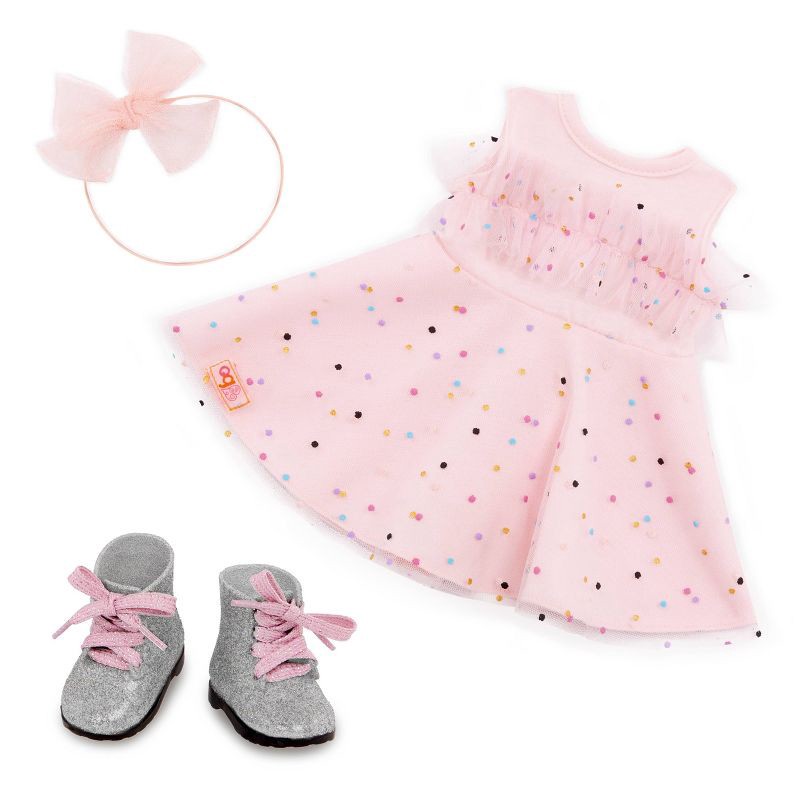 Fashion fans can party in playful style with the Our Generation Pink & Colorful outfit! This 18-inch doll clothing set includes a confetti-print dress complete with a large bow headband and boots with…