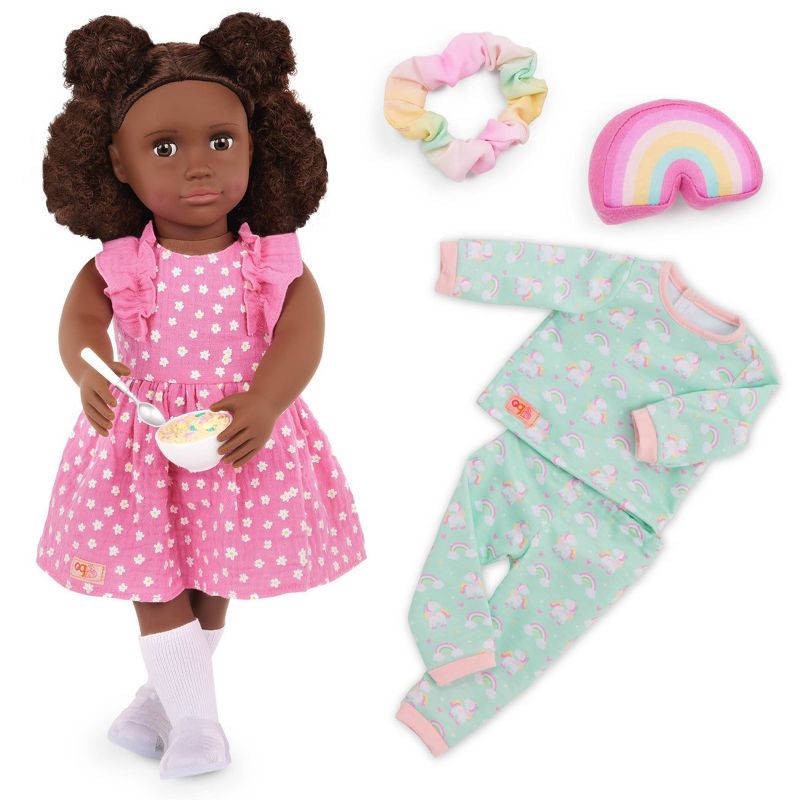 Explore double the dress-up fun with Our Generation 18-inch doll Zoey! She wears a cute pink dress decorated with mini florals and comes with a bonus rainbow pajama! Themed accessories like a hair scr…