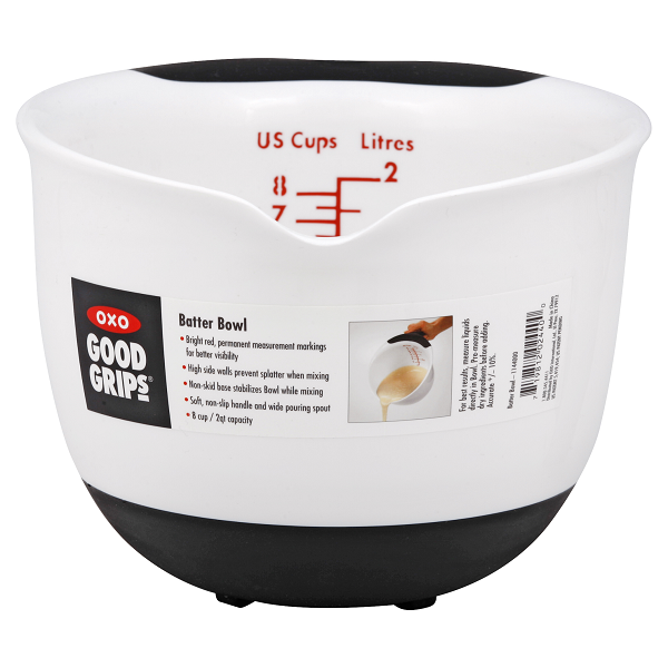8 cup/2 qt capacity. Bright red, permanent measurement markings for better visibility. High side walls prevent splatter when mixing. Non-skid base stabilizes bowl while mixing. Soft, non-slip handle a…