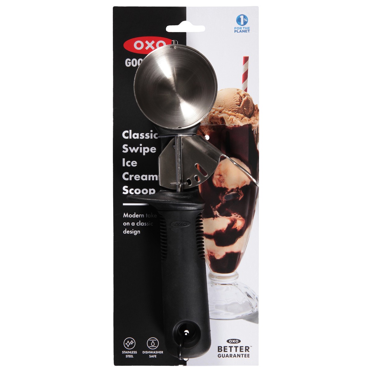 Modern take on a classic design. Stainless steel. Dishwasher safe. Durable stainless steel won't chip, pit or rust. Easy-to-use lever releases rounded scoops with a squeeze. Soft, comfortable handle f…