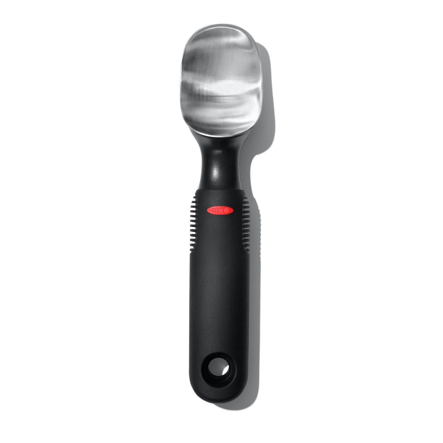 Dig into even rock-solid ice cream right away: The curved head of the OXO SoftWorks Solid Stainless Steel Ice Cream Scoop let you glide right through hard ice cream. It is nicely weighted and has a co…