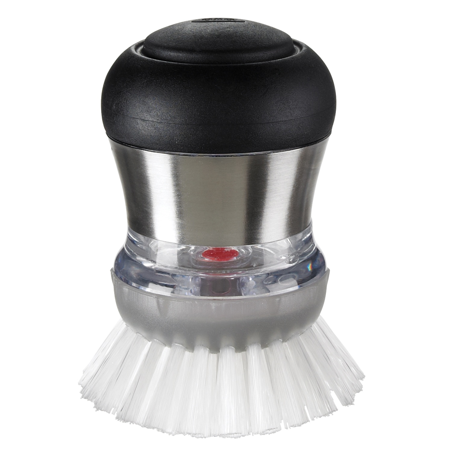 OXOs unique palm brush makes washing dishes easier than ever. Simply press the soft top to release soap when you want it. Durable nylon bristles scrub away baked-on food and are safe for nonstick cook…