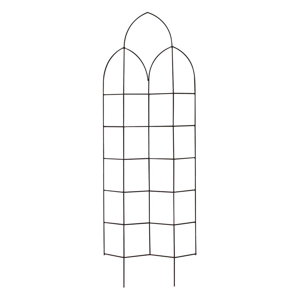 72-inch offset spire trellis. Features gothic inspired arch top with two smaller arches overlapping it. The horizontal and vertical support rods form a windowpane pattern. The rods are angled outward …