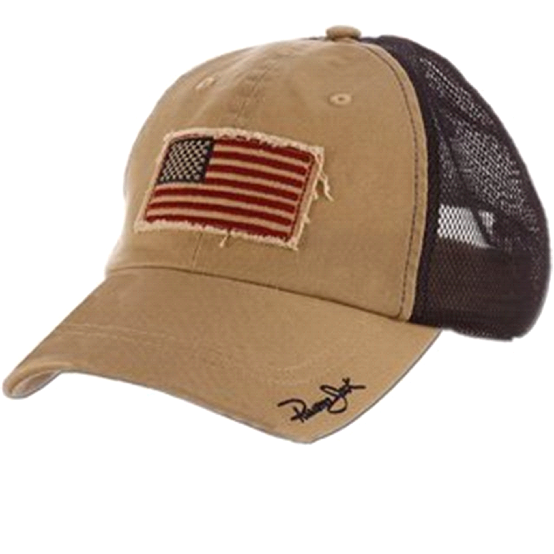 This cotton and polyester Panama Jack unstructured cap is designed with an American flag patch, embroidered logo and 3'' wide bill brim for sun protection. With it's mesh backing and antique t-slide c…