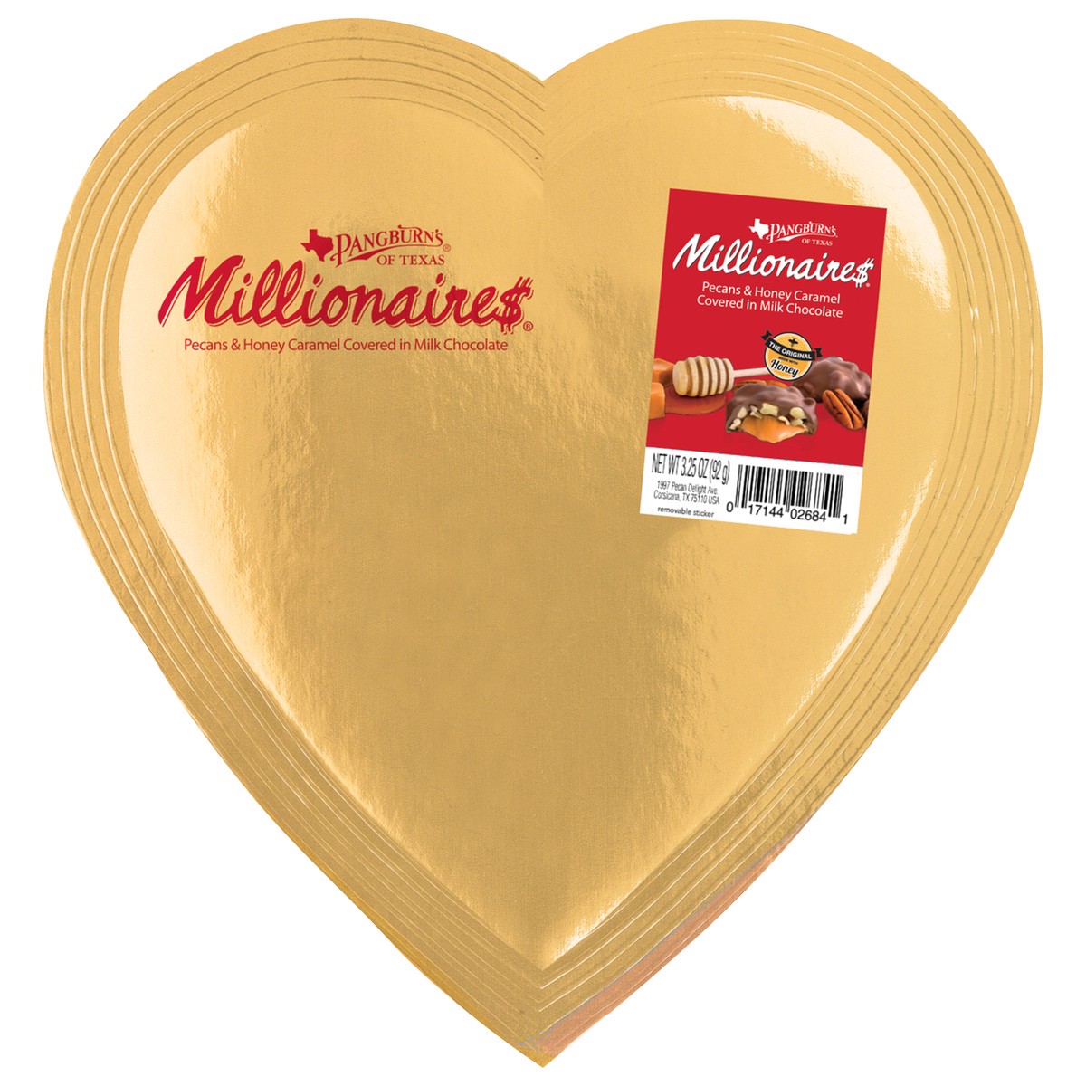 PANGBURN'S OF TEXAS Milk Chocolate Millionaires Valentine's Day Heart Gift Box, 3.25 oz., contains 4 generous servings of buttery pecans and creamy caramel enrobed in mouthwatering milk chocolate. Mak…