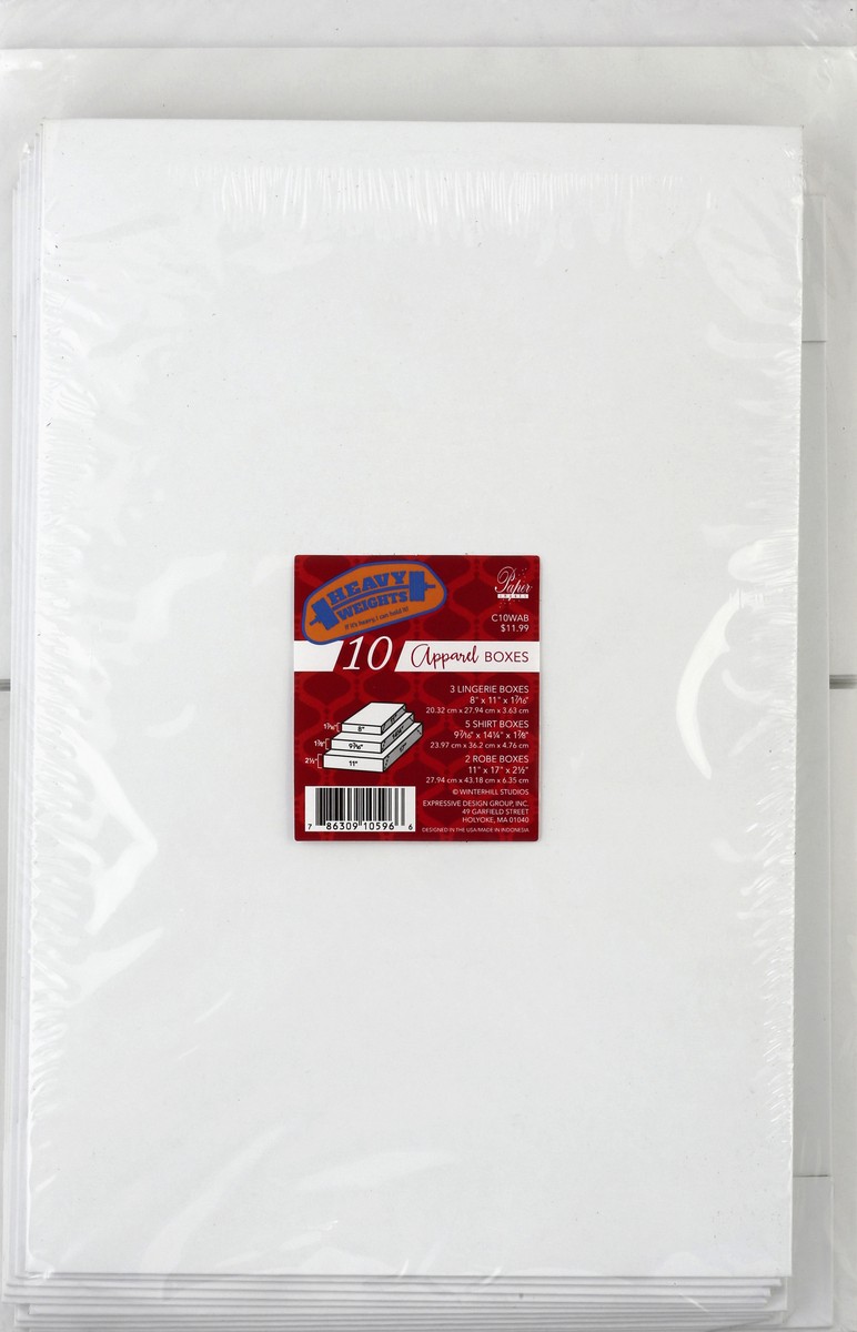 3 Lingerie Boxes: 8 inch x 11 inch x 1-7/16 inch (20.32 cm x 27.94 cm x 3.63 cm). 5 Shirt Boxes: 9-7/16 inch x 14-1/4 inch x 1-7/8 inch (23.97 cm x 36.2 cm x 4.76 cm). 2 Robe Boxes: 11 inch x 17 inch …