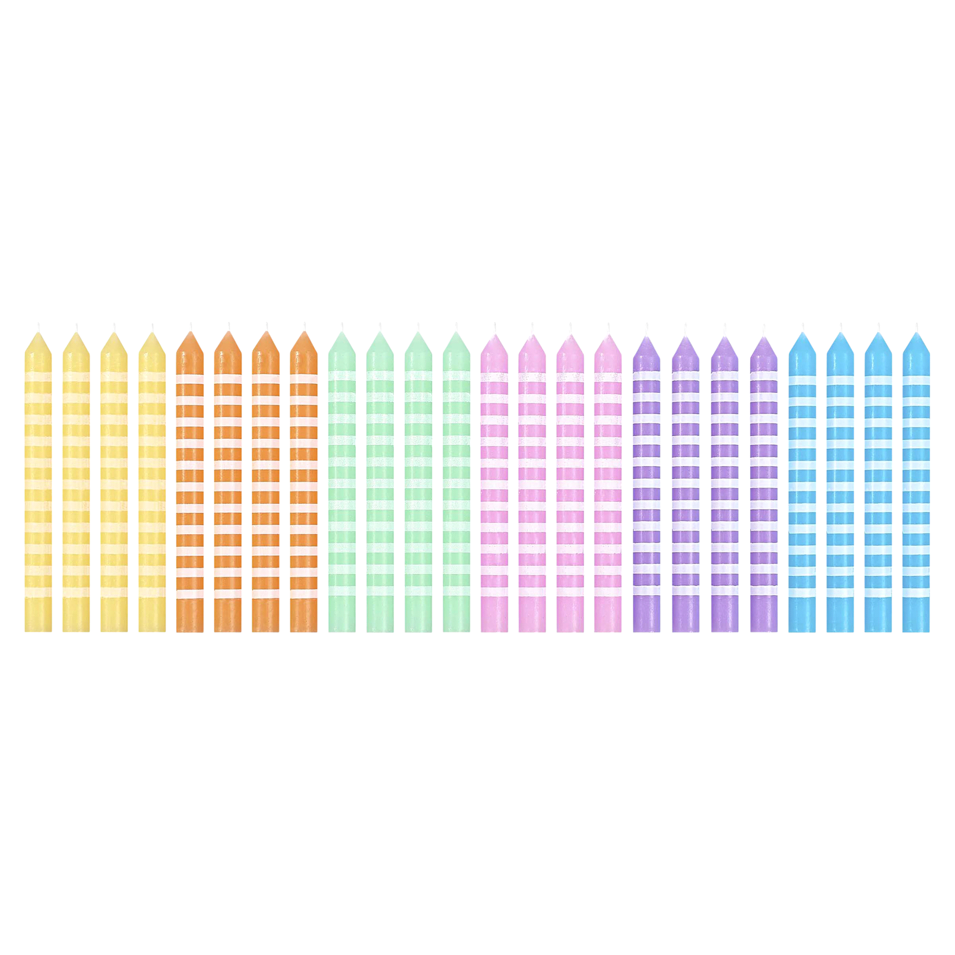 Light up any celebration with this 24-pack of pastel stripe candles from Papyrus! Multicolored candles shine in a pastel rainbow of six colors, 4 each of blue, purple, green, orange, yellow, and pink …