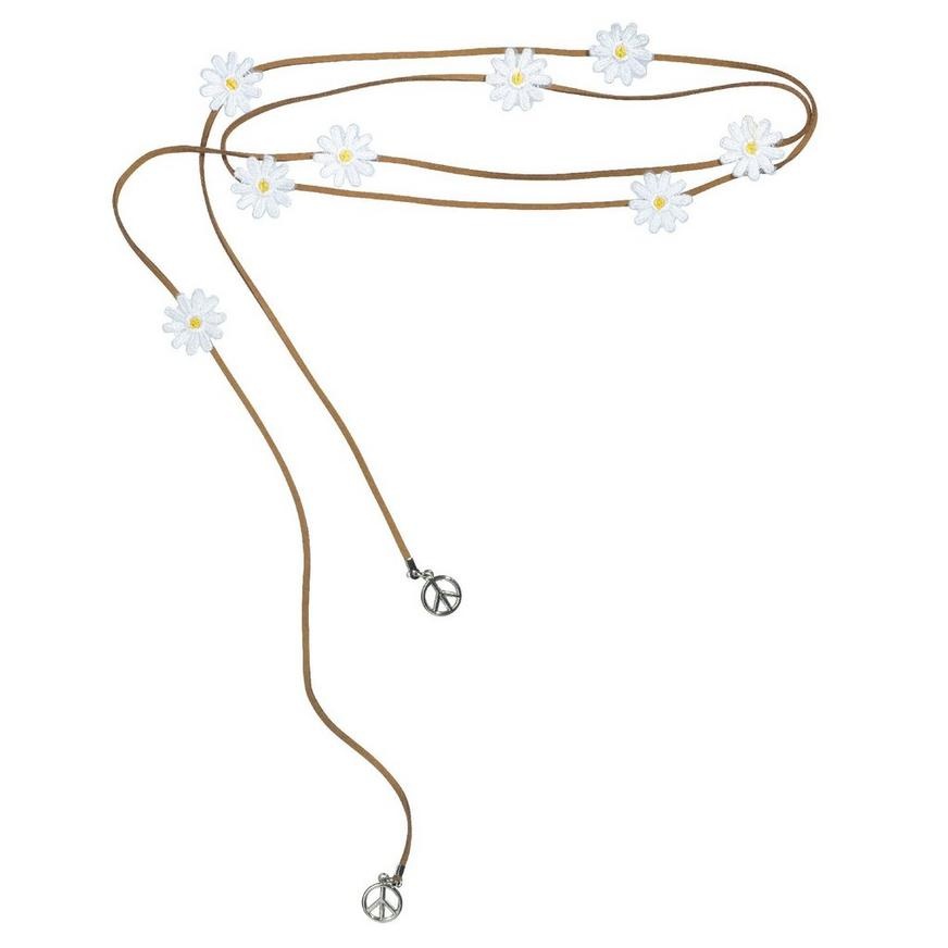 Sport cute festival fashion with our Festival Flower Headband This groovy hair accessory features a suede cord with fabric daisy accents and peace sign charms that hang from each end. With an adjustab…