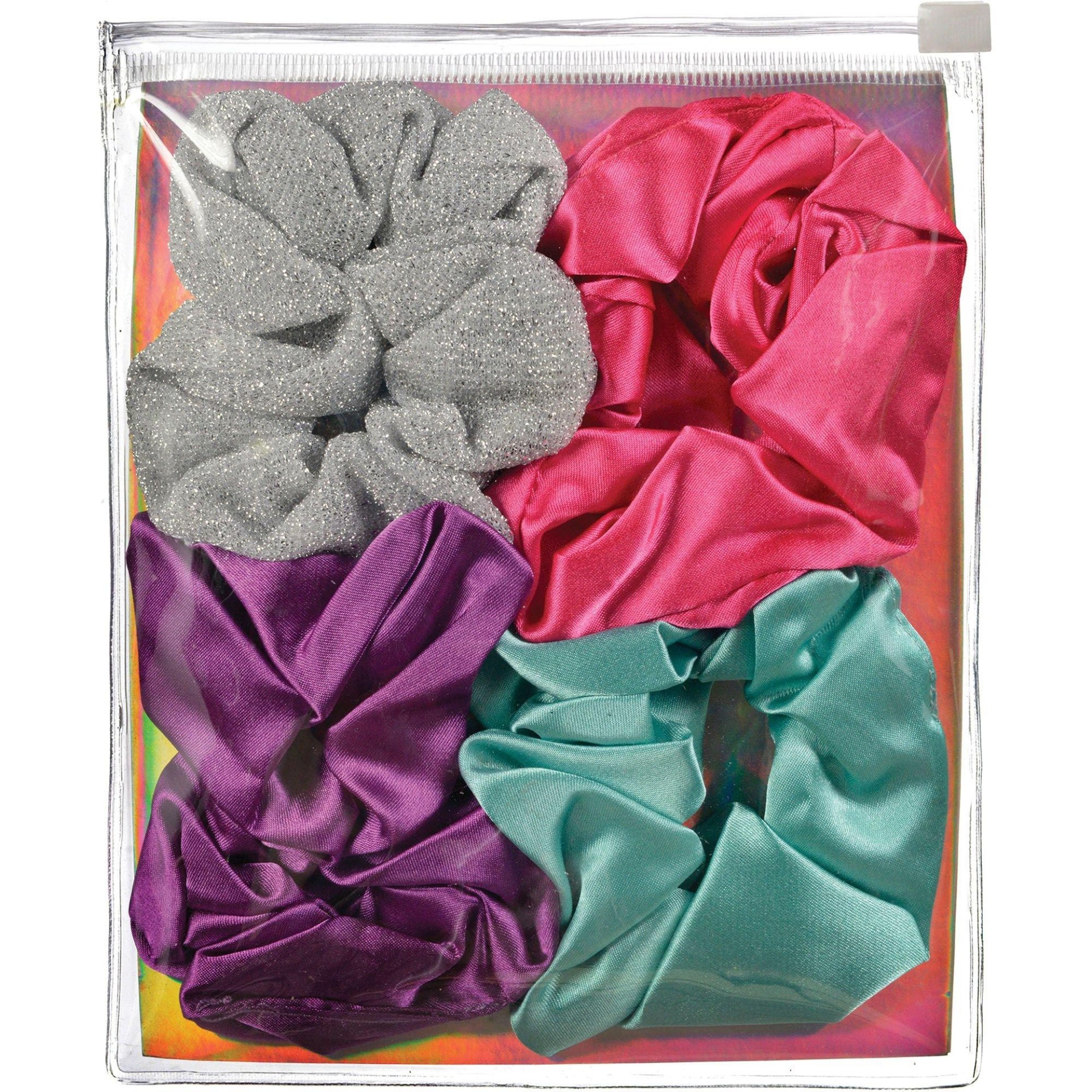This Multicolor Scrunchie Pouch includes pink purple teal and silver scrunchies that add a pop of color to any hairstyle. The smooth satin fabric is gentle on hair and the silver scrunchies glitter fi…