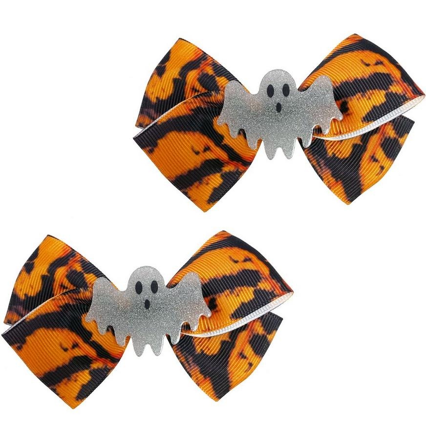 Add a touch of spooky to your everyday look with these Halloween hair bows. Featuring a sparkly ghost in the center these bows are orange and black tiedye and include a clip in the back for easy fasteā¦