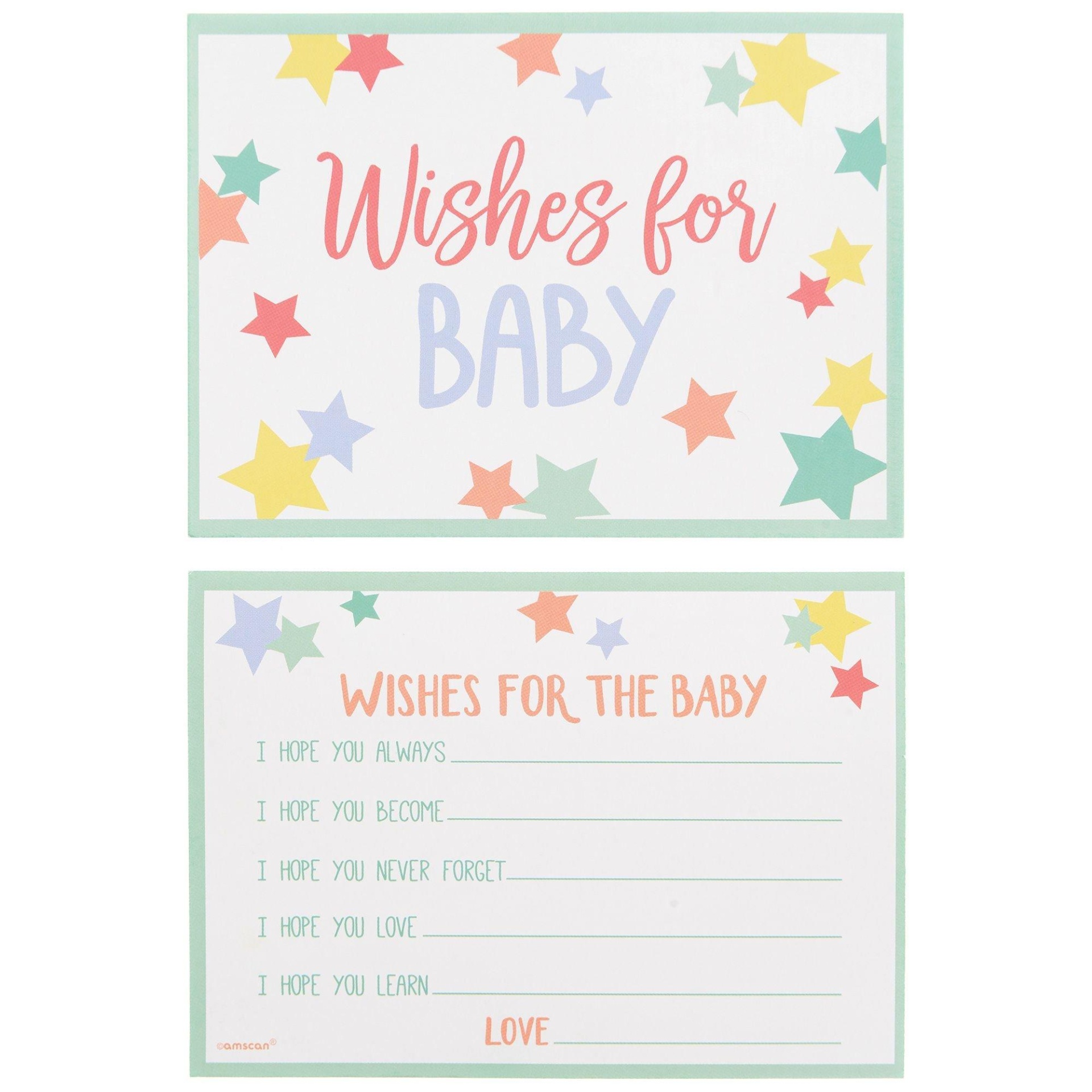 Get guests to share their wisdom with this pastel notecard set. Each one features a scattering of stars and a Wishes For The Baby headline on one side and a series of fillintheblank sentences on the o…