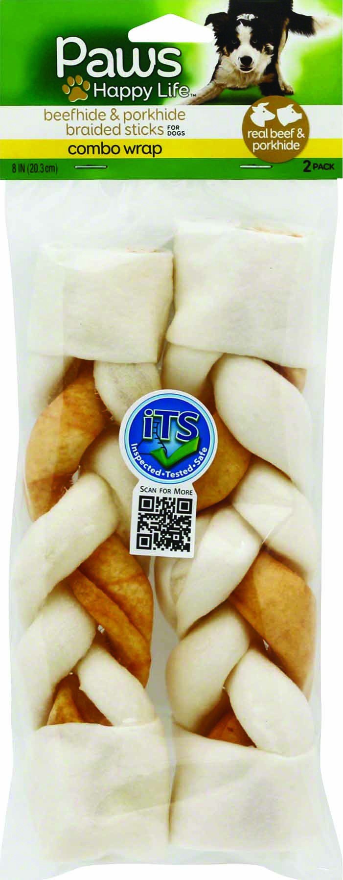 slide 1 of 1, Paws Happy Life Combo Wrap Beefhide & Porkhide Braided Sticks For Dogs, 2 ct