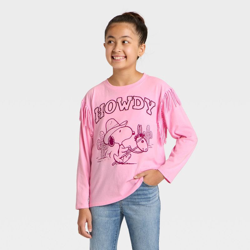 Step out in snug style with the Girls' Howdy Snoopy Fleece Sweatshirt with Fringe in Light Pink. This playful sweatshirt features a charming Howdy Snoopy graphic with fun rodeo-inspired fringe details…