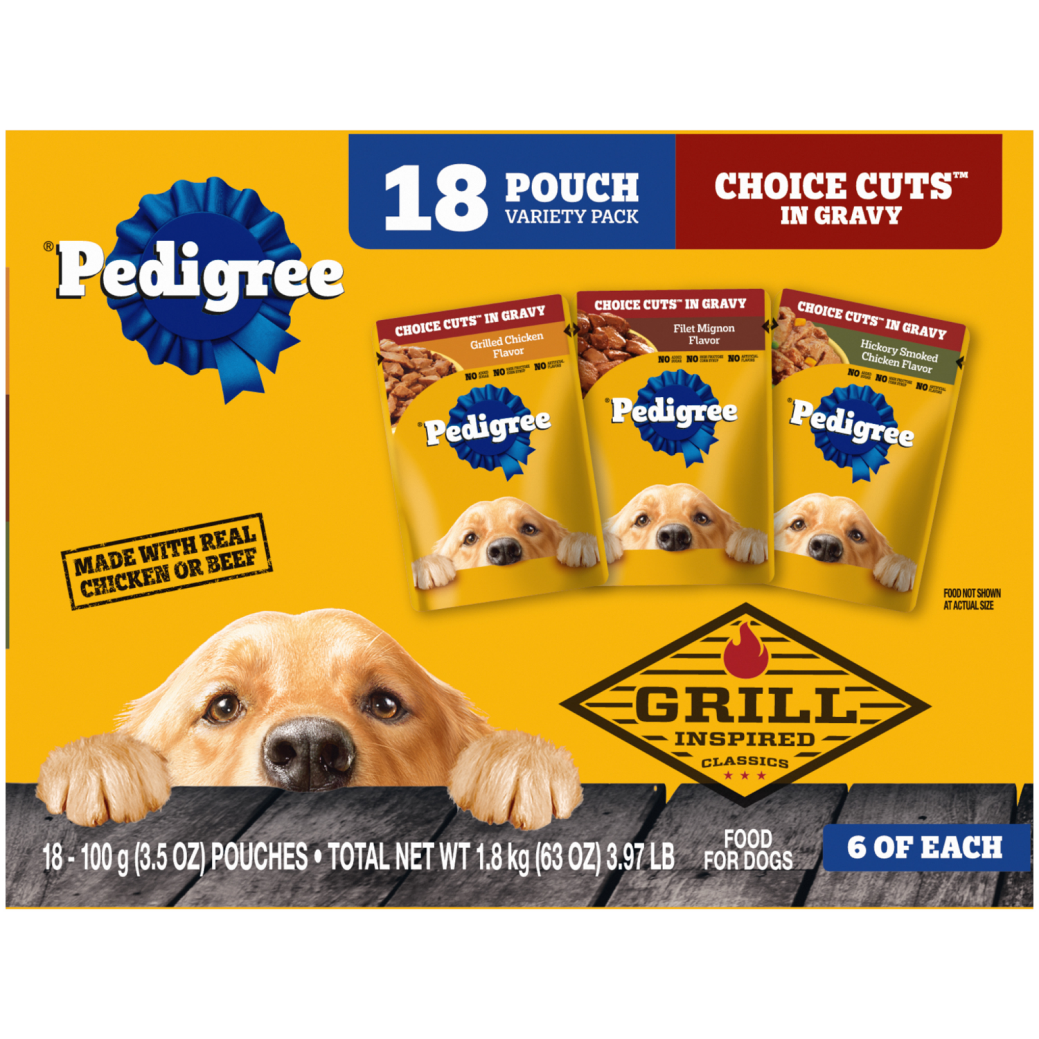 Guaranteed Analysis Calorie Content (calculated): 843 kcal ME/kg, 84 kcal ME/pouch. Pedigree Choice Cuts in Gravy Grilled Chicken Flavor are formulated to meet the nutritional levels established by th…