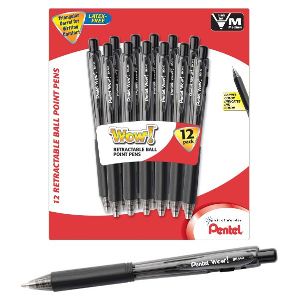 Pentel Wow! Retractable Ballpoint Pens, Medium Point, 1.0 mm, Black Barrel, Black Ink